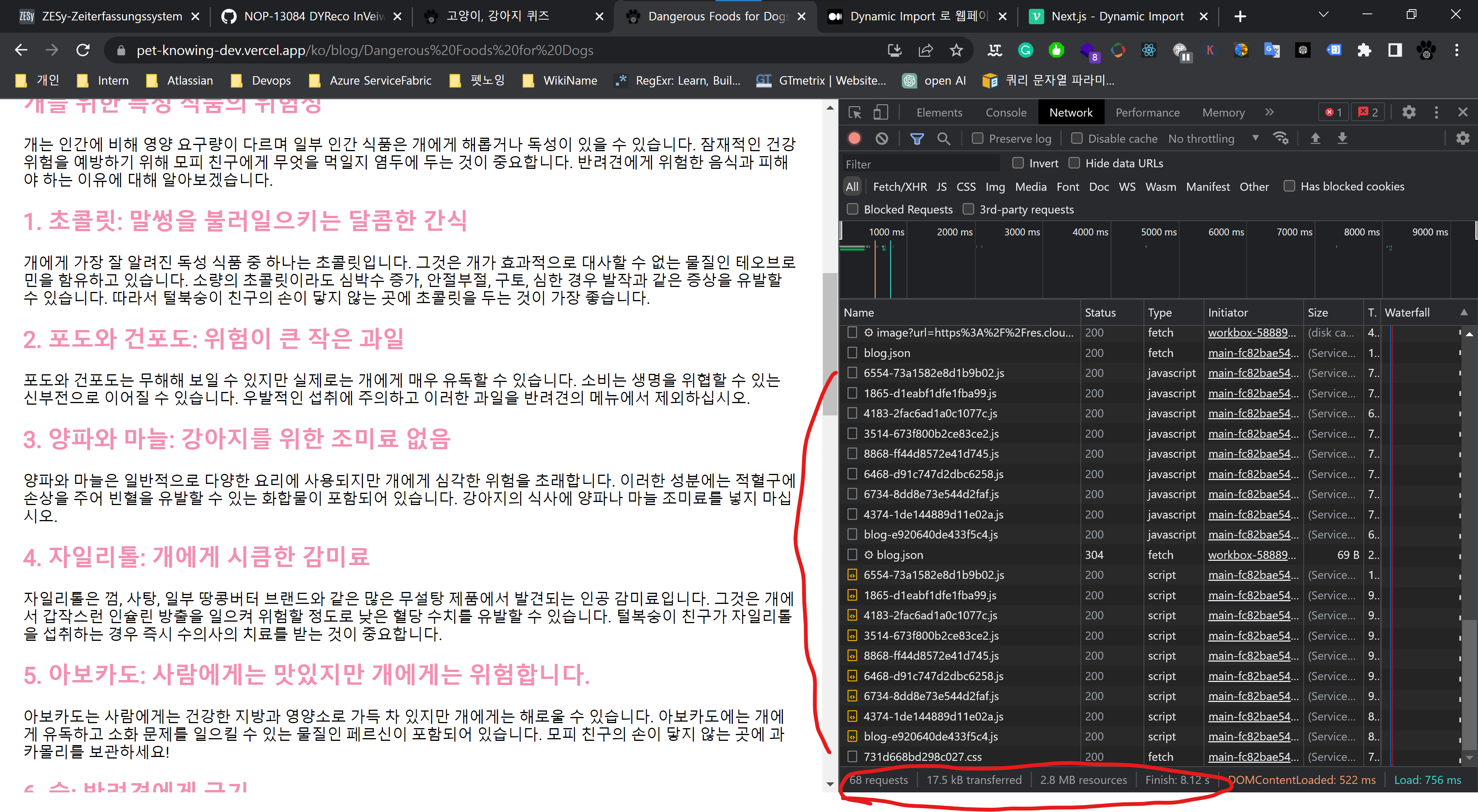 일반 가져오기(import) 모듈과 달리 동적 가져오기(dynamic import)는 로드 시기와 방법에 대해 유연합니다.읽을 때 모듈 파일을 모두 로드하는 대신 사용 시 동적 가져오기를 요청할 수 있습니다.모듈을 별도의 번들 파일로 코드 분할하여 개별적으로 가져올 수 있으므로 초기 페이지 로드가 줄어듭니다. Next.js는 ES2020의 Dynamic import를 지원하며, 리액트 역시 React.lazy, React.Suspence를 통해서 지원한다. 필자는 Next.js 사용함으로써, Next.js 환경에서 우선 예시화면을 보여주고자 한다. 사용방법은 각 공식문서에서 참조하자.